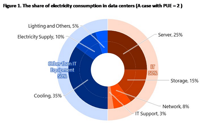 The breakdown of the composition of electricity consumption by data centers tells us that we will have to tackle both IT equipment and cooling.