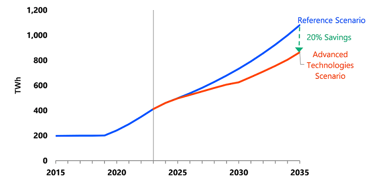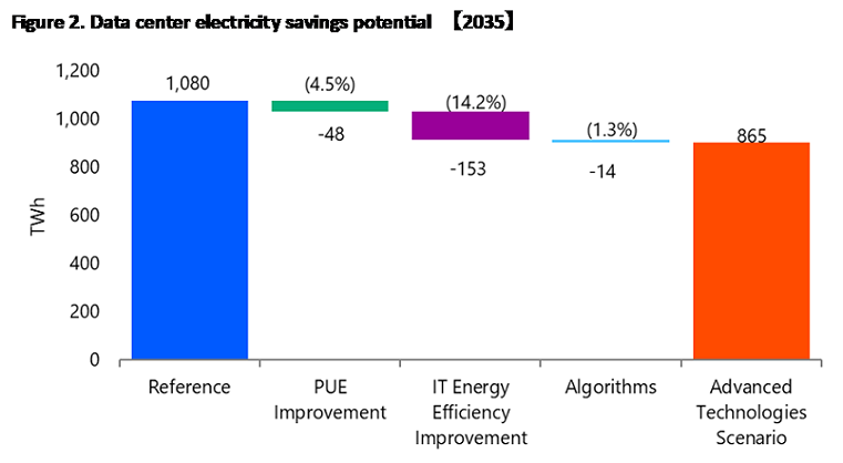 Energy efficiency improvements through AI can be expected in various sectors beyond industry. In road transport, including passenger vehicles, buses, and trucks, AI can potentially lead to energy savings by 36.5 Mtoe globally, about 0.9-2.9% savings by 2035 on top of the ATS. Better projections can avoid traffic congestion and optimization of freight truck load. AI can also optimize the routing of vehicles. Through autonomous driving, fuel efficiency can be improved by maintaining constant speeds and minimizing air resistance. Energy efficiency of offices and commercial sectors can be improved as well. Through better design using AI, energy efficiency of buildings and regional districts can be enhanced. By analyzing sensor data of movement of people and air flow, lighting, air conditioning, and elevators, we can make buildings and regional districts more energy efficient in the operation. The total of energy efficiency savings can potentially reach 8.8 Mtoe or 102 TWh globally. This scale is equivalent to about 10% of the electricity demand for data centers at 1,080 TWh in 2035. AI also has potential in the residential sector. AI can optimize air conditioner operation by analyzing data such as room and outside temperature, household electricity use, solar PV generation, and electricity tariffs. The IEEJ expects that energy efficiency gains of 1.5 Mtoe (2.3% improvement) in advanced economies and 0.9 Mtoe (1.5% improvement) in EMDEs by 2035 are possible.