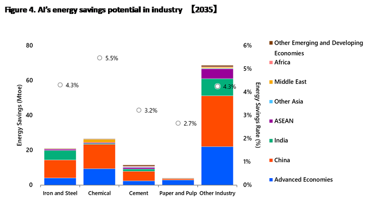 The industry sector has been the main target of energy efficiency efforts, but they were basically dependent on the experience and knowledge of veteran operators and were focused on particular processes. With AI, optimal operation can be derived through analyzing large datasets, factory-wide optimization, and dynamic control on a real time-based forecast. Energy efficiency improvements can be expected in various sub-sectors including steel, chemicals, cement, paper and pulp, and other industries including machinery. Regionally, substantial energy efficiency gains can be expected in Advanced Economies, China and India. According to the analysis by the IEEJ, energy savings in the industry sector can potentially be improved globally by 2-5% by 2035. This improvement is on top of the improvement reflected in the ATS of the Global Energy Outlook issued by the IEEJ.
